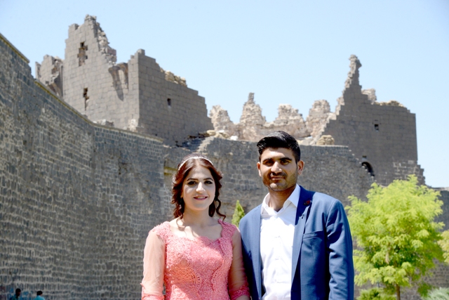 Çatışmaların sona ermesi ile kimi vatandaş tarihi yapıların bulunduğu alanlara giderek stres atarken, kimisi de yeni evlendiği eşini yanına alarak Sur dibine gelerek hatıra fotoğrafı çektiriyor. Sur’da hatıra fotoğrafı çeken bu çiftte objektiflerimize böyle yansıdı.