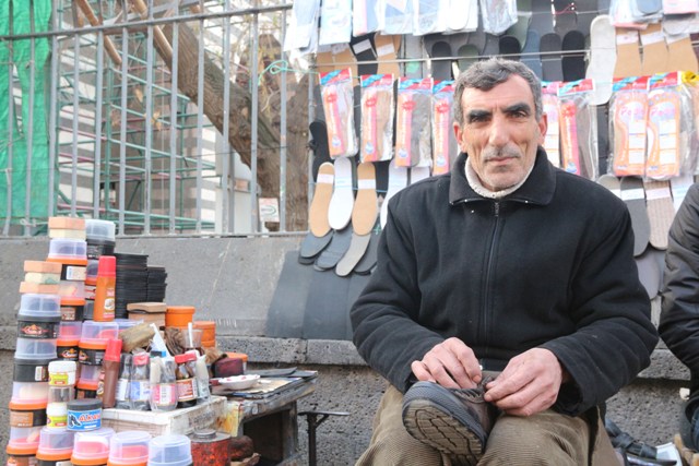 Dursun Yakışık, “ 80’den beri burada ayakkabı boyuyorum. Şimdi geçim çok daha zor, işler eskisi gibi değil. Eskiden buralara günde 1000 tane yabancı gelirdi, şimdi ise gelen bir tek yabancı yok. İnsanlar buraya gelmeye korkuyorlar. Tabii ki, geçen sene gibi değil buralar, şimdi daha sakin ama yine de gelen yok. 6 çocuğum var, 4’ü çalışmıyor. Benim günlük boyacılıktan kazandığım 20 30 TL ile geçinmeye çalışıyoruz. Bu soğukta burada oturmak kolay değil. Soğukta oturmaktan dizlerim romatizma oldu. Kışın bizim işler düşüyor, en ufak bir yağmur yağsa işler kesiliyor. Yaz olsa neyse, kışın tamir işleri de azalıyor.”