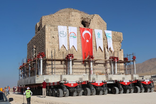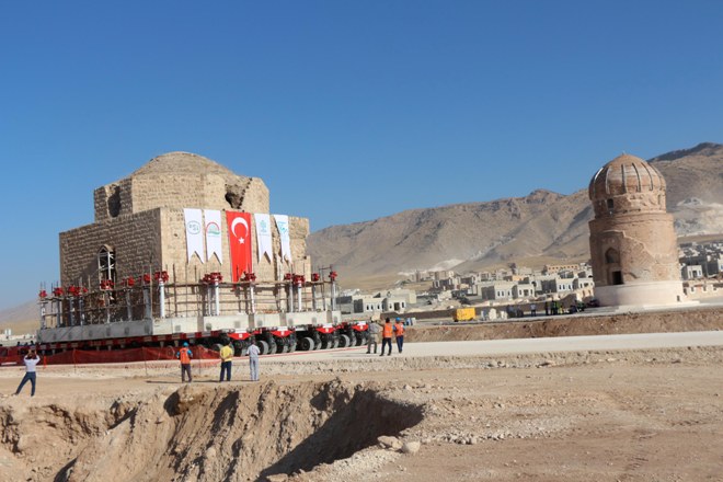 Tarihi Hasankeyf ilçesindeki Ilısu Barajı nedeniyle sular altında kalacak eserleri koruma yönelik düzenlenen çalışmalar kapsamında, sabah erken saatlerinde taşınmaya başlanan 540 yıllık tarihi Artuklu Hamamı, Tarım ve Orman Bakanı Bekir Pakdemirli'in katılımıyla yeni yerleşim yerine ulaştı.