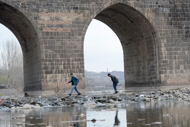 Dicle Nehri’ndeki su seviyesinde düşüş yaşanınca Diyarbakır’daki tarihi on gözlü köprüde ilginç görüntüler ortaya çıktı. Su seviyesindeki düşüşle birlikte gençler Nehir’e girip fotoğraf çektiriyor.