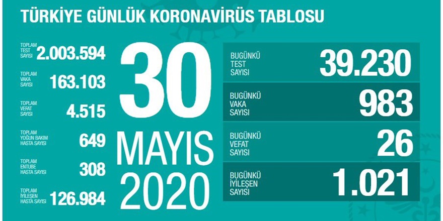 Türkiye'de son 24 saatte 983 kişiye Kovid-19 tanısı kondu, 26 kişi hayatını kaybetti, toplam vaka sayısı 163 bin 103, can kaybı 4 bin 515 oldu.