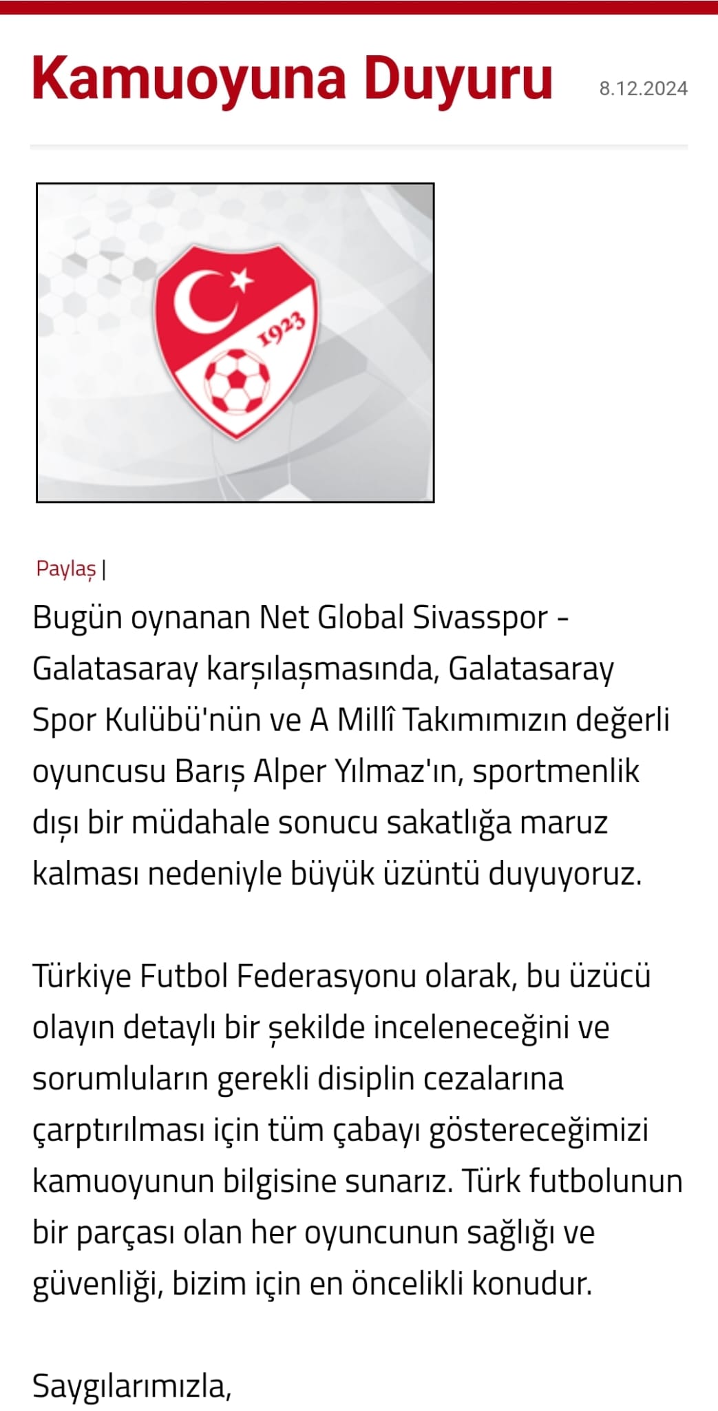 "Galatasaraylı ve Millî Takım oyuncumuz Barış Alper Yılmaz'ın sportmenlik dışı bir müdahale sonucu sakatlanmasından dolayı büyük üzüntü duyuyoruz. Bu olayın detaylı bir şekilde inceleneceğini ve sorumlulara gerekli disiplin cezalarının verilmesi için tüm çabanın gösterileceğini kamuoyuna bildiririz. Türk futbolunun tüm paydaşlarının sağlığı ve güvenliği bizim için en önemli önceliktir."