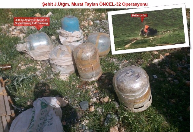 DİYARBAKIR - TSK’dan yapılan yazılı açıklamada, “Diyarbakır/Silvan ve Hazro ilçeleri kırsalında icra edilen operasyon kapsamında araziye tuzaklanmış vaziyette 6 adet 12 kg tüp içerisinde yaklaşık 300 kg amonyum nitrat ve şeker kullanılarak hazırlanmış EYP düzeneği ile Hani-Lice karayolu üzerinde bulunan menfezde 4 adet 25 kg'lık bidon içerisinde 200 kg amonyum nitrat ve şeker kullanılarak hazırlanmış EYP düzeneği ile bol miktarda yaşam malzemesi ele geçirilmiştir”