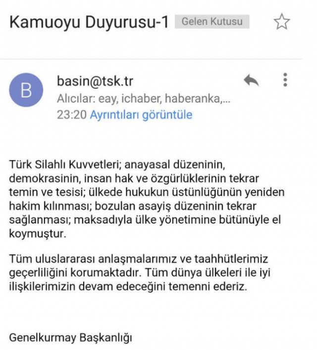 TSK'dan gönderilen e-posta'da şöyle denildi;