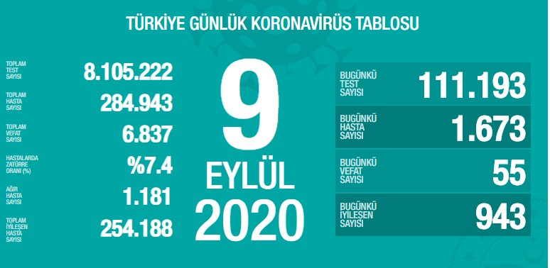 TİGRİS HABER - Sağlık Bakanı Fahrettin Koca sosyal medya hesabından: “Toplamda 8 milyondan fazla test yapıldı. Bugün ise 110.000’den fazla yapılan test sonucunda 1.673 yeni tanı konmuş hastamız var. Tedbirlere hepimiz destek verirsek virüse karşı daha güçlü olacağız. Bu güce destek verin, sevdiklerimizi koruyalım” ifadelerinde bulundu. (Haber Merkezi)