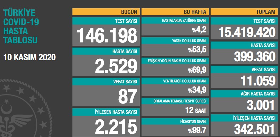 Toplam test sayısı 15 milyon 419 bin 420'ye ulaştı. Toplam hasta sayısı 399 bin 360, vefat sayısı 11 bin 59, ağır hasta sayısı 3 bin 1 oldu.