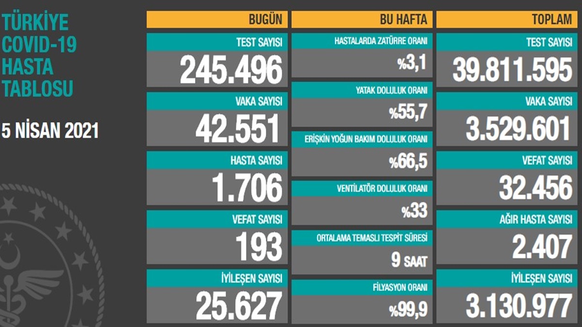 Sağlık Bakanlığı tarafından günlük koronavirüs tablosu paylaşıldı. Son verilere göre son 24 saatte 193 kişi hayatını kaybetti, 42 bin 551 kişi korona oldu.