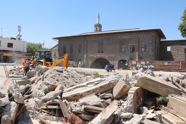 Çevre ve Şehircilik Bakanlığı, tarihi Ulu camii önündeki alanda geçtiğimiz gün başlayan restorasyon çalışmaları tüm hızıyla sürüyor. Restorasyon kapsamında tarihi Ulu Camii’nin önünde bulunan çay ocağı ve pasaj girişi kaldırılırken, Ulu Cami önü yeni yüzüyle dümdüz bir alan olarak hizmet verecek. Ulu Camii önündeki alan Diyarbakır’a özgü bazalt taşlar ve mermerle kaplanırken, alanda bulunan pasaj girişi iptal edilerek üzeri cam kaplama yapılacak.