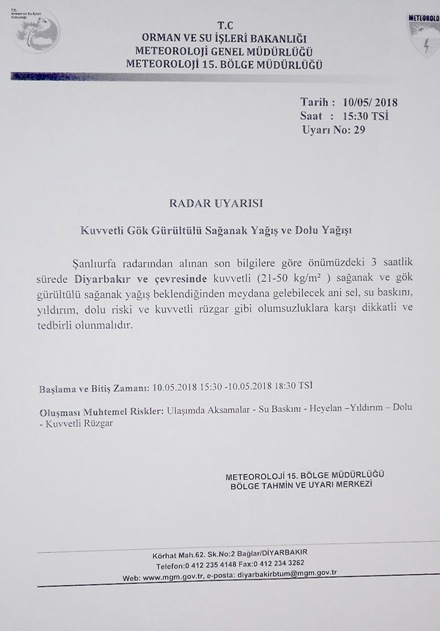 Diyarbakır Valiliğinden yapılan açıklamada, “Şanlıurfa radarından alınan son bilgilere göre önümüzdeki 3 saatlik sürede Diyarbakır ve çevresinde kuvvetli (21-50 kg/m) sağanak ve gök gürültülü sağanak yağış beklendiğinden meydana gelebilecek ani sel, su baskını, yıldırım, dolu riski ve kuvvetli rüzgar gibi olumsuzluklara karşı dikkatli ve tedbirli olunmalıdır” denildi.