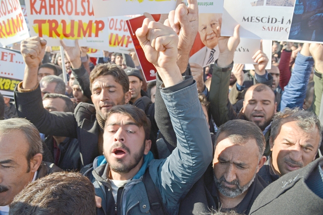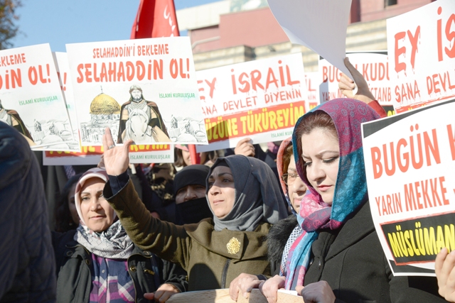 Sık sık tekbir getiren protestocular, ellerinde "Kahrolsun Trump", "Kudüs düşerse İstanbul düşer, İstanbul düşerse ümmet düşer", Kahrolsun siyonizm" ve "Kudüs'ü ezansız, namazsız ve Müslümansız bırakma Allah'ım" yazılı pankartlar taşıdı, "Müslüman uyuma Kudüs'e sahip çık", "Kahrolsun İsrail", "Hamas'a selam, direnişe devam", "Kudüs İslam'dır İslam kalacak" ve "Mescid-i Aksa onurumuzdur" sloganları attı.