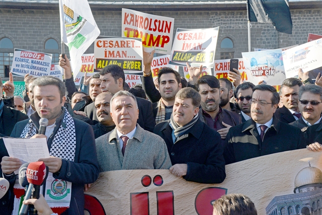 ABD Başkanı Donald Trump'ın Kudüs'ü İsrail'in başkenti olarak tanıma ve Tel Aviv'deki büyükelçiliklerini Kudüs'e taşıma kararı Diyarbakır’da yoğun bir kalabalık tarafından protesto edildi. İslam aleminin 5.haremi şerifi olarak kabul edilen tarihi Ulu Cami’deki hutbede ve protesto eyleminde dikkat çekici ifadeler kullanıldı. İslam düşmanı olarak değerlendirdiği ABD ve İsrail’e beddua eden imam Osman Yağmur, Kur’anı Kerim’deki “ Allah bir zalime başka bir zalimi müsallat eder” ayetine atıfta bulunarak ABD ile füze gerginliği yaşayan Kuzey Kore’nin Amerika’yı vurmasını temenni etti. İslam dünyasının yaşadığı sorunların Müslümanlar arasında birlik ve beraberlik olmamasına bağlayan Yağmur, İslam dünyasının içindeki korku, ümitsizlik, dağınıklık ve kargaşaları, kardeş kavgasını aşması halinde bu zülüm ve baskıların son bulacağını dile getirdi.