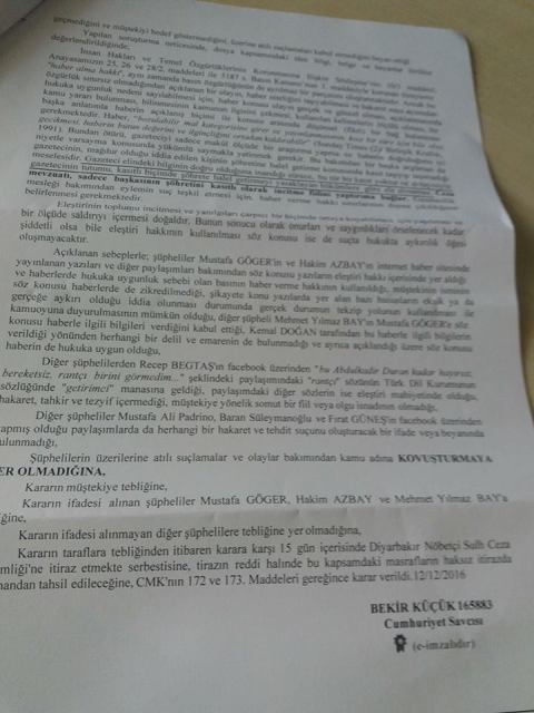 Diyarbakır Basın ve Bilişim Suçları Soruşturma Savcılığı,Diyarbakırspor başkanı Abdülkadir Duran’ın kendisine hakaret ettikleri gerekçesiyle gazeteciler Yılmaz Bay ve Saffet Azbay hakkında yaptığı suç duyurusu için kovuşturmaya yer olmadığına dair karar verdi. Dosyayı inceleyen Savcı Bekir Küçük, Duran’ın hakaret ve tehdit iddialarının gerçeği yansıtmadığını,kendisine yapılan eleştiri ve suçlamaların gazetecilik mesleği kapsamında yapıldığını ifade ederek dosyayı kapattı.