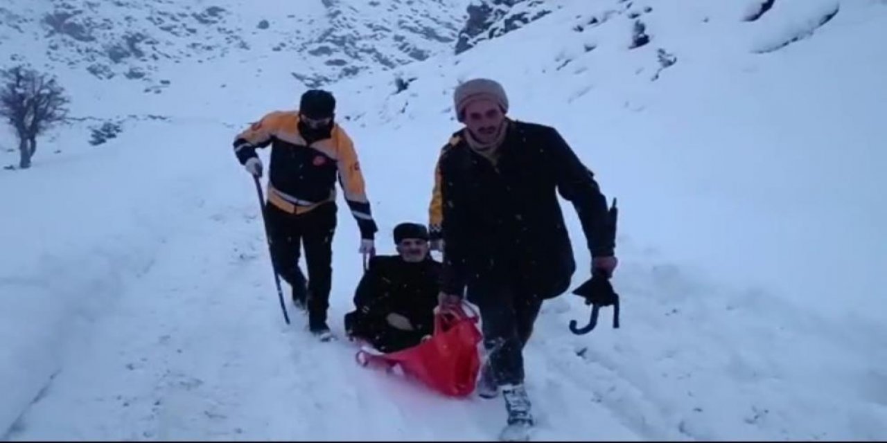 Yaşlı hasta kızakla ambulansa ulaştırıldı