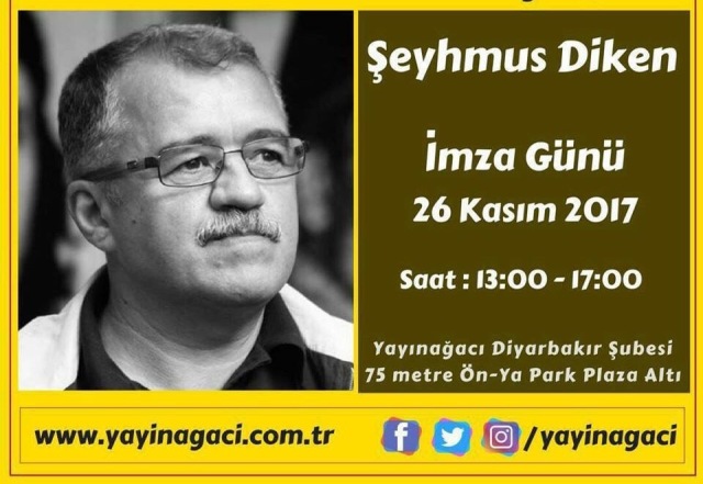 Şeyhmus Diken bugün 26 kasım 2017 pazar günü Kültür Bakanlığı Diyarbakır Korosu sanatçısı Udi YERVANT’ın mini bir resitali ile birlikte yeni kitabının yanında diğer kitaplarını imzalamak üzere okurlarıyla buluşacak.