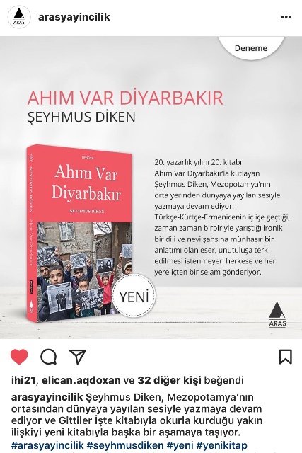 Diken’in kitap sahibi olarak yazarlık geçmişinin 20. Yılı. Şeyhmus Diken’in, geçtiğimiz günlerde 20. Kitabı “Ahım Var Diyarbakır” Aras Yayıncılık yayınları arasında çıktı.