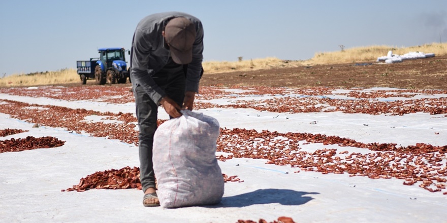 TİGRİS HABER - Şanlıurfa ve Diyarbakır sınırları arasında bulunan sönmüş volkanik dağ olan Karacadağ’ın verimli arazileri yüzlerce ailenin geçim kaynağı oldu. Sert coğrafi yapısı ve kara taşlarıyla bilinen Karacadağ, son zamanlarda bilinçli tarım politikalarıyla bölgenin ekonomisine katkı sağlıyor. Nisan ayında ekilen domateslerin, hasadı ile birlikte Karacadağ kurutulmak için serilen domateslerle kırmızıya büründü. İşçiler tarafından toplanan ve ikiye bölünerek, tuzlanan daha sonra beyaz örtüler üzerinde 50 derecelik güneş sıcaklığına bırakılan domatesler, kuruduktan sonra torbalara konularak, İzmir’e, oradan da başta Amerika olmak üzere, Avrupa’nın birçok ülkesine ihraç ediliyor.