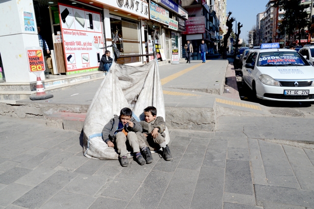 Sabahın erken saatlerinde mesaiye başlayan Ahmet ve Salih Mamo adlı kardeşler, yıllar önce Suriye’de yaşanan iç savaştan kaçarak Diyarbakır’a geldi. 7 kişilik Mamo ailesinin reisi hamallık yapıyor. Anne ev hanımı. Ahmet ve Salih adlı kardeşler ailenin en büyük çocukları. Çocuklar yaşam mücadelesi veren ailelerine katkı için minik bedenlerinden büyük arabalarını alarak her gün 10 TL için işe koyuluyor. Kentin bir çok yerini gezerek kağıt ve şişe toplayan kardeşler, yorgun düşünce Ofis semtinde mola veriyor. Minik kardeşler mola verirken objektiflerimize böyle yansıdı.