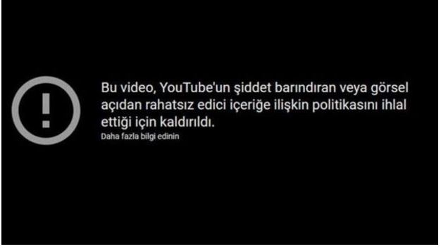 Videoya ulaşmak isteyenlerin karşısına "Bu video, YouTube'un şiddet barındıran veya görsel açıdan rahatsız edici içeriğe ilişkin politikasını ihlal ettiği için kaldırıldı" yazısı çıktı.