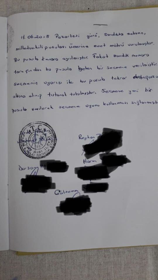 Sandık görevlileri tarafından tutulan tutanakta ise pusulaya mührün ‘sehven’ vurulduğu belirtildi. Sandık başkanı ve 4 sandık görevlisi tarafından imza altına alınan ve resmi mühürle onaylanan tutanakta şu ifadeler eyer verildi: “11.06.2018 Pazartesi günü sandıkta sehven milletvekili pusulası üzerine evet mührü vurulmuştur. Bu pusula kenara ayrılmıştır. Fakat sandık memuru tarafından bu pusula gelen bir seçmene verilmiştir. Seçmenin uyarısı ile bu pusula tekrar muhafaza altına alınmış tutanak tutulmuştur. Seçmene yeni bir pusula verilerek seçmenin oyunu kullanması sağlanmıştır”